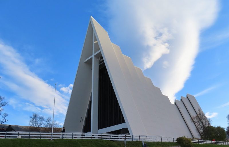 Wir sind in die Hauptstadt der Arktis angekommen. Der Charme von Tromsø entfaltet sich am besten, wenn es dunkel ist. Ganz dunkel. Aber natürlich muss die Bebbin dem Meenzer zumindest das eine Wahrzeichen der nördlichsten Stadt Norwegens zeigen: Die Eismeerkathedrale. Und nein, sie hat nicht die Form eines Eiskristalls, was auch ganz schön gewesen wäre, wenn auch vermutlich eine architektonische Herausforderung. Sie ist dreieckig. Warum? Als Hommage an die ebenfalls dreieckigen Gestelle, an denen der Stockfisch getrocknet wird. Wenn das nicht ein schöner Gedanke ist. Eine Kirche für den Stockfisch.