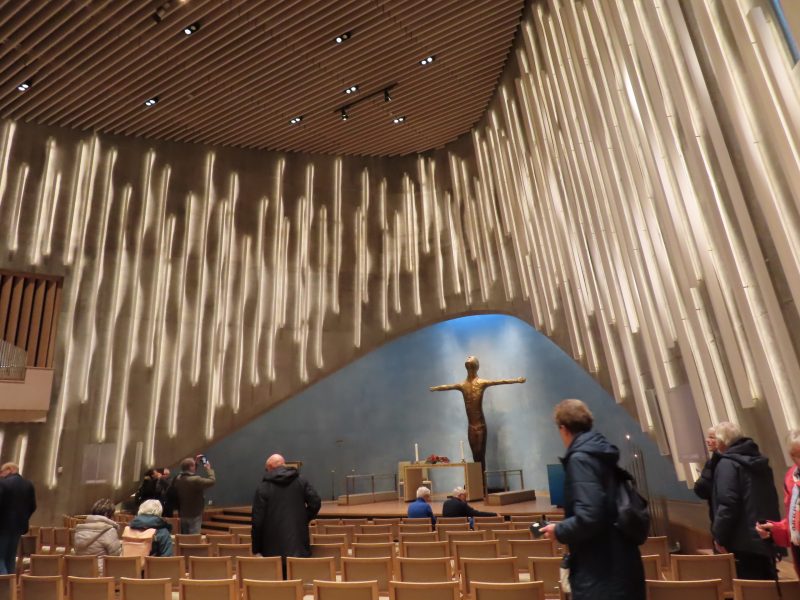 Bevor wir diese sehr eindrückliche Kathedrale verlassen, erfahren wir noch, dass die Jesus-Statue es fast nicht bis hierher geschafft hätte. 4.5 m hoch, 2 Tonnen schwer und aus Bronze gegossen, wurde sie von der fernen Toscana mit italienischen Lastwagen nach Norwegen transportiert. Sie kamen in Oslo an. Und es schneite und natürlich hatten die Lastwagen keine Spikes an den Reifen. Am nächsten Tag stand es auf vorderster Seite in den Zeitungen: Jesus war die Einreise nach Norwegen veweigert worden.“